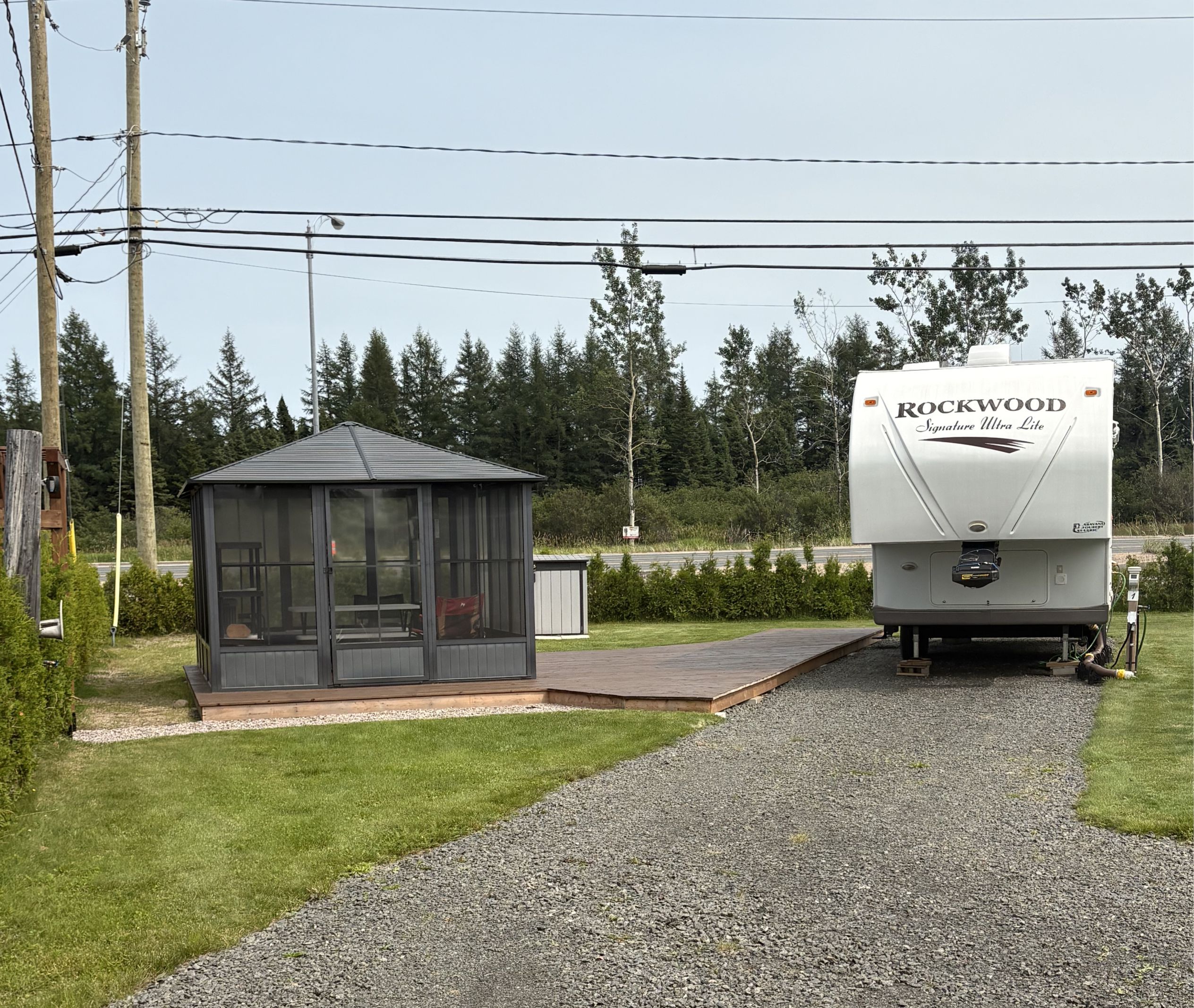 Nous disposons également d’un terrain *Premium, incluant tous les services réguliers ainsi qu’un solarium de 10pi x 14pi avec l’ensemble patio fourni pendant la durée du séjour.